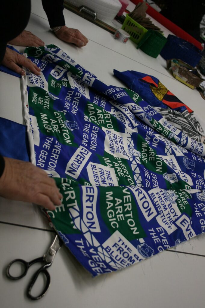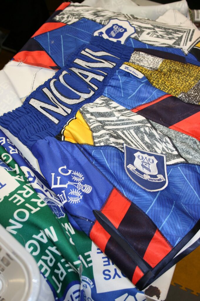 Built entirely from retro Everton shirts, the design took shape as a patchwork of the club’s past. This included iconic kits such as the 1990 home and away shirts, the 1992 away shirt, and the 1995 FA Cup Final goalkeeper jersey worn by Neville Southall.