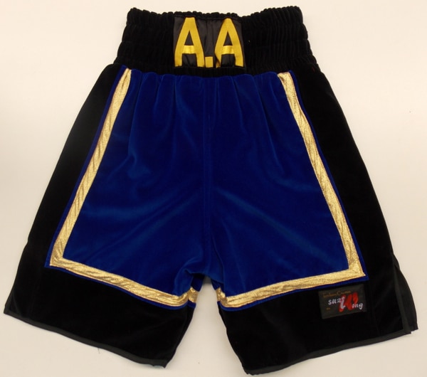 Ali wanted something traditional in a Floyd Mayweather style short only in his own colours, blue, black and gold.  We can make this short with any embroidery from any fabric. Let us know what you require on an email using the contact us button, calling us on the number above or print out on of our design your own templates.