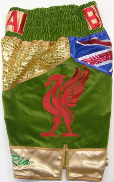 We make all sorts of shorts for amateur boxers, some in the style of professionals they like and some in there own style, with clubs names embroidered on and other personal things like liverbirds, etc. These are made from velet and sparkle and the waistband alterante patch really sets them off with the contrast embrodiery. If you want something similar you can have the shorts in any material, wetlook, velvet, satin, sparkle. Just let us know what you require using either one of our design your own templates or on the contact us button at the top. Put all your details down, what names you want on the front, back etc, fabric, colours and we will get back to you with a price. All our items are custom made and therefore require a custom price.