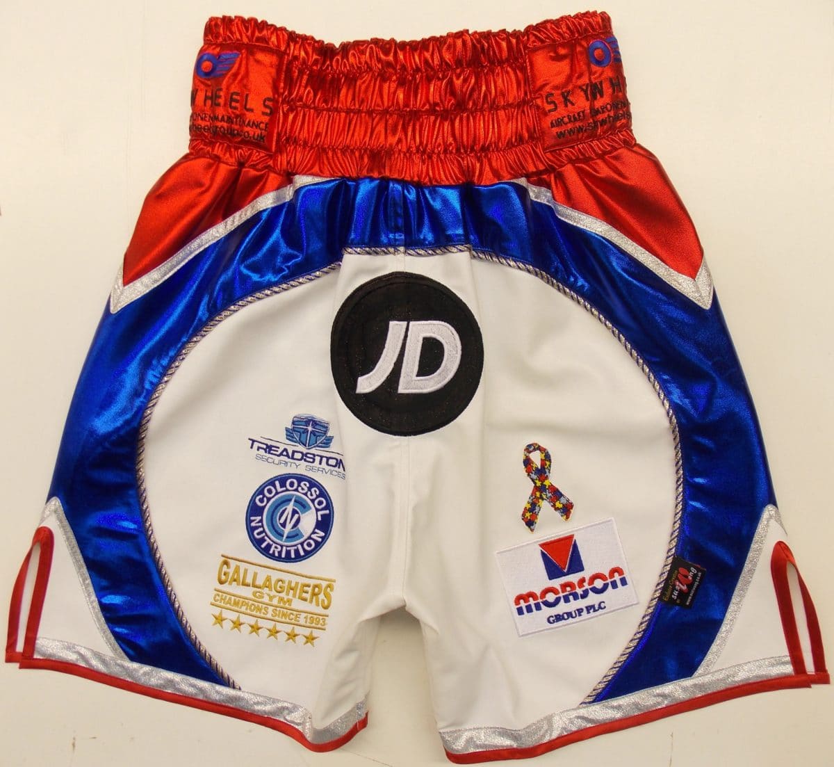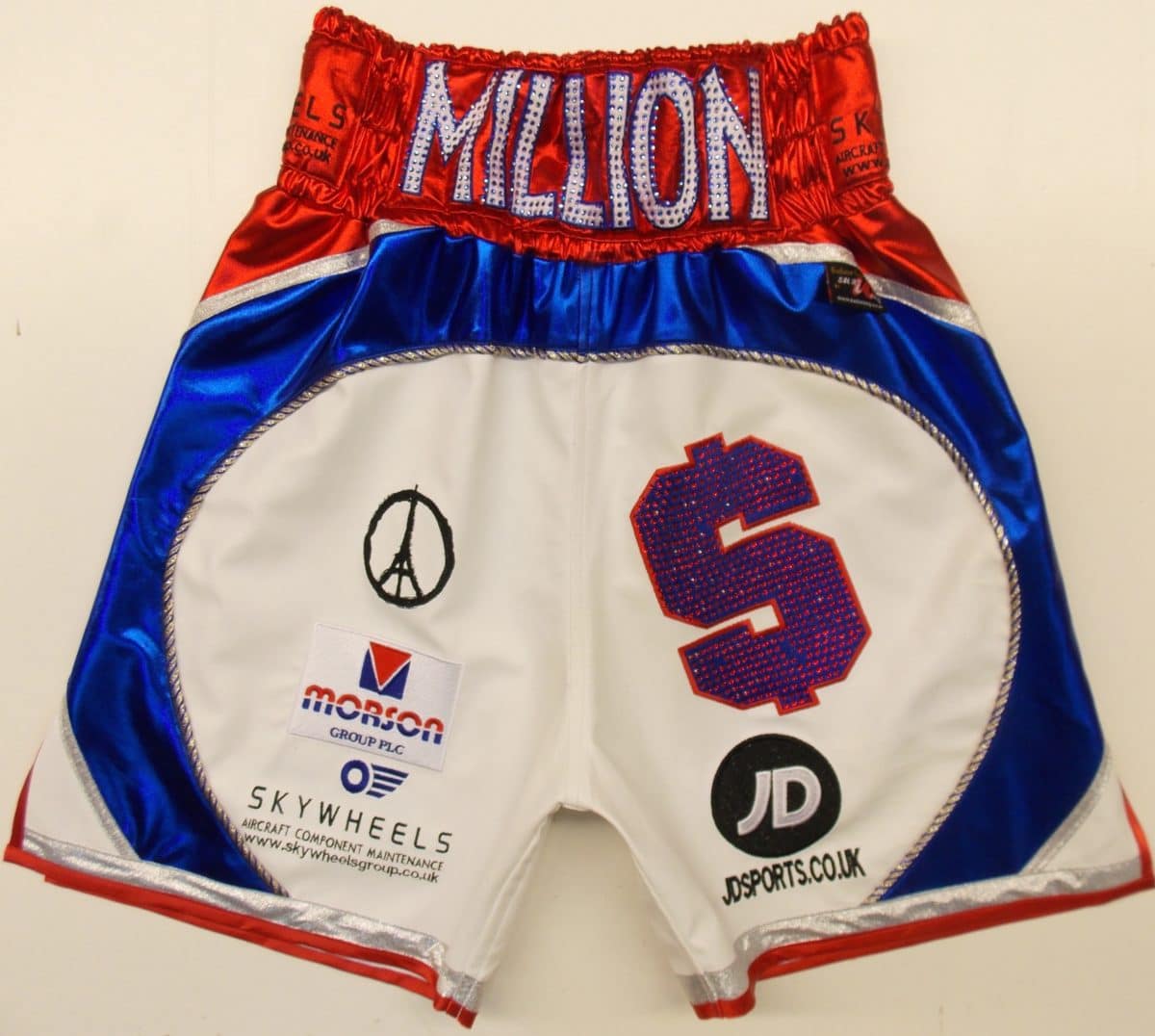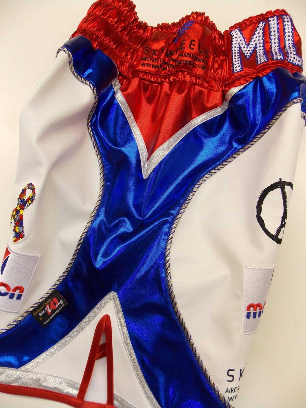 We went through fabric colours to go with Crollas new custom made boots. These were Anthonys second choice shorts incase of a colour clash, something professional fighters have to have as a requirement of the British Boxing Board. We went for a red and blue wetlook with white leatherette and blue and red Austrian Crystals crystals. Over 1500 Swarovksi crystals were used on the shorts, for the $ sign and names. They add value to the shorts, but waw they look amazing under the bright lights and shine, reflecting like small mirrors. You can have your names, logos etc in the Swarovski, just ask us to price with and without if you just curious on the price.