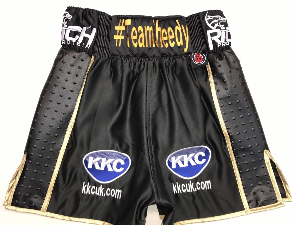 Ben likes the shorter style shorts, and we advise something lightweight in the black matt satin to allow him to move on his feel well without the added effect of a heavy short that can make you pay as you get into the later rounds of a fight.