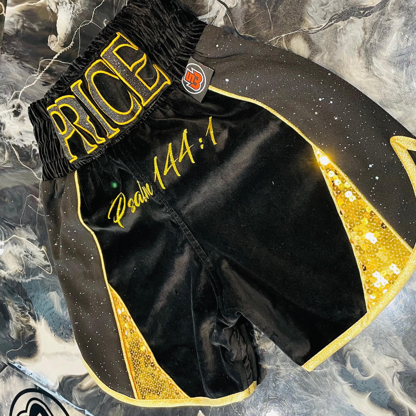 Finishing details matter in bespoke fightwear. Where required, we can incorporate embroidered names, logos and sponsor elements so they read clearly on camera and remain hard-wearing after training and travel. For Gino Price, the overall look was kept sleek and impactful, with design elements chosen to complement the black-and-gold palette while leaving room for future sponsor additions—ideal for an active amateur career and progression through competition.