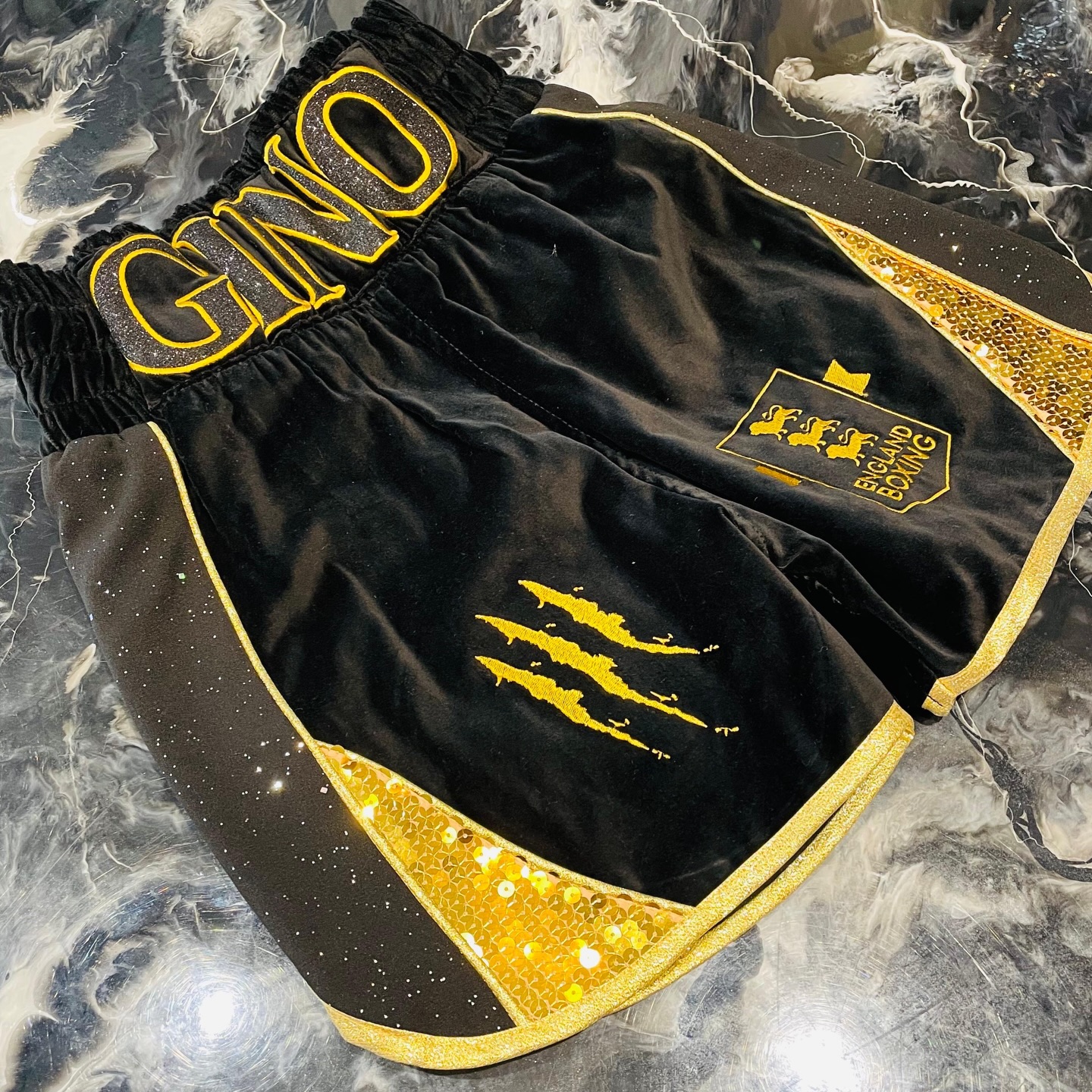 Every Bespoke Boxing project starts with a clear brief—what the athlete needs the kit to say before the first bell rings. For Gino Price, the direction was bold and premium: deep black tones contrasted with gold shine to create a powerful, classic silhouette that reads instantly in photos and video. Our design team worked closely with Gino to refine the balance of velvet, sequin placement and shimmer panels so the set looked sharp from every angle—ring walk, corner shots and centre ring.