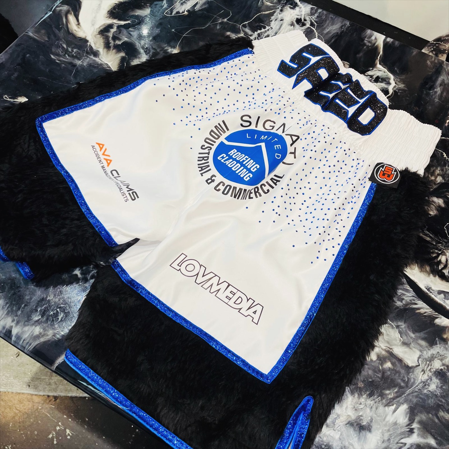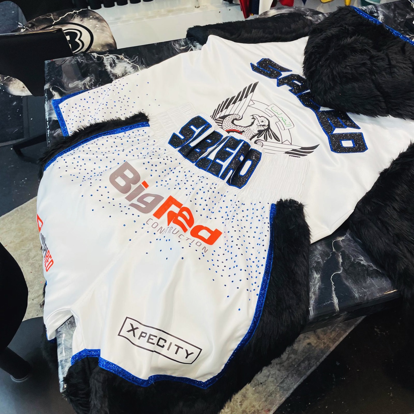 For this custom boxing kit, we utilised high-quality satin as the base material, which not only offers durability but also provides a luxurious feel and shine, essential for professional boxing attire. To elevate the design, we incorporated stunning fur accents and sparkling glitter Farook trim, transforming a simple kit into a bespoke beauty. The meticulous addition of crystal detailing scattered across the shorts and jacket adds a touch of glamour, ensuring that YSaeed0 steps into the ring with confidence and flair.