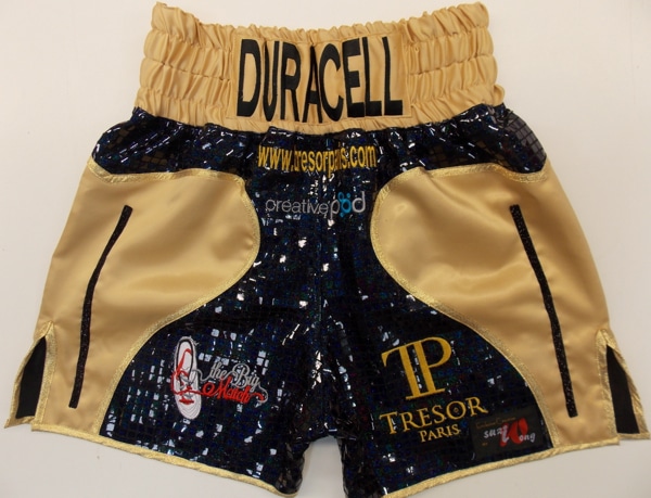 Ben ‘Duracell’ Jones filled in one of our design your own templates and sent it us back via email with all his sponsors logos to get a quote.  We can make these shorts in any fabric with your own logos and names on there.  Just let us know what you require on the contact us button at the top of the page or print one of our templates and send it back to us for a quote for your custom made Suzi Wong boxing shorts.