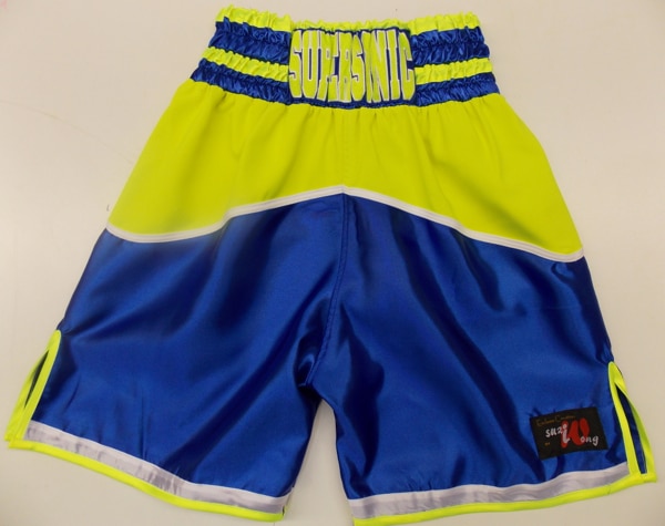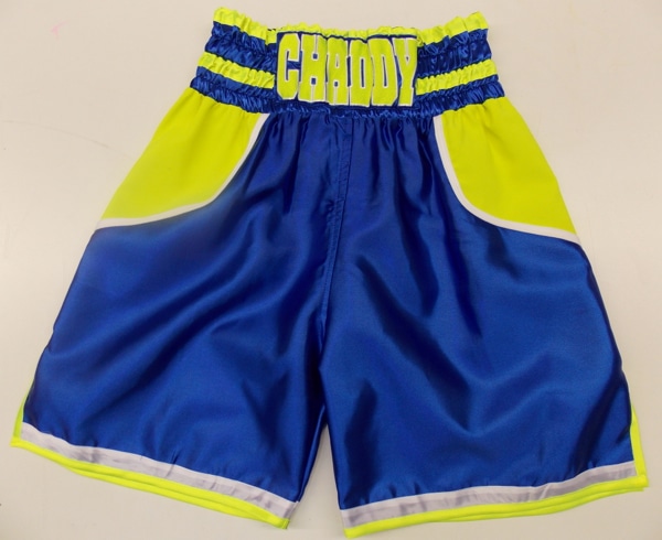 Chad wanted something different using illuminous and blue together trimmed with white, he went for a Anthony Crolla style short just changed the colours around.  We can make these shorts in any colour, have a look through the website portfolio and get some ideas of the colours you like.  The illuminous is really popular at the moment and can work with many colours.  Let us know what you require either on an email or by filling in one of our templates and we will get back to you with a price.