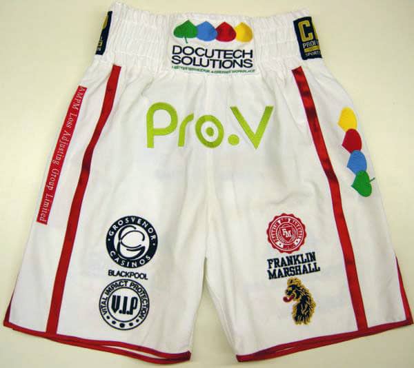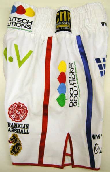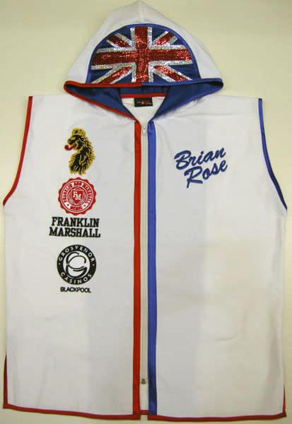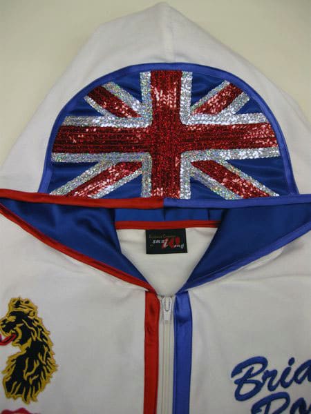 Brian Roses whites velvet kit including sleeveless ring jacket with a sequin Union Jack on the hood. He wanted to go with a British theme on red white and blue so we decided on white velvet shorts and jacket with red and alternate blue tape on opposite sides. Brian has lots of sponsors and each of these were made into embroidery disks and emboidered onto the kit. We can embrodiery or print anything onto kit, provided you have a suitable image, pdf. jpeg, to sent across to us. We can make this kit in any colour, fabric, sparkle, velvet, satin, wet look. Just let us know what you require either using the contact us button or one of our templates that you can print off and fill in to send back to us. We will get back to you with a quote.