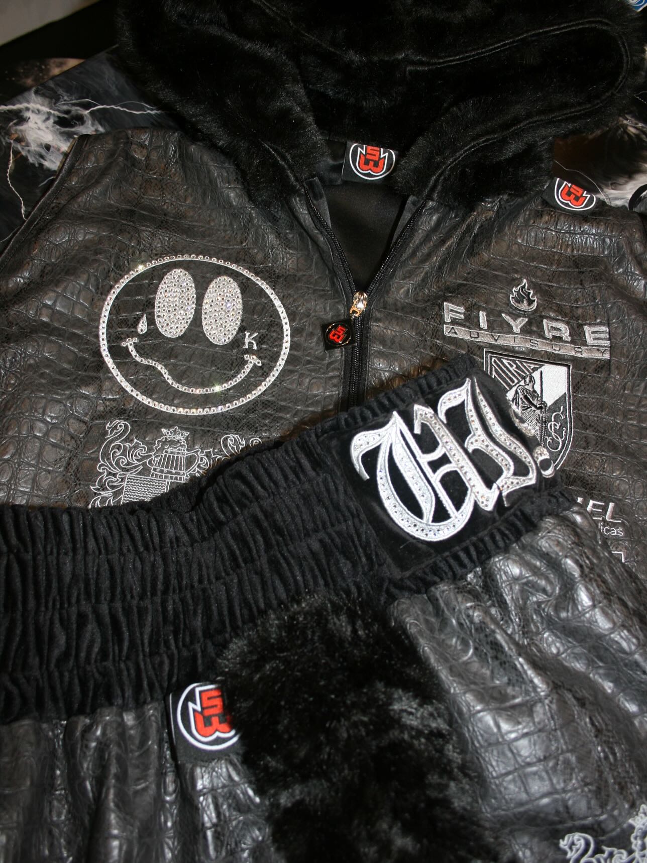 The design process for the Usima boxing kit was an intricate collaboration between the Suzi Wong Team and the boxer, Usima. Our goal was to create a unique ensemble that not only reflects Usima’s personality but also meets the demands of professional boxing. We carefully selected high-quality materials, including black crocodile skin and plush black fur, to ensure that the kit stands out in the ring while also providing comfort and durability.