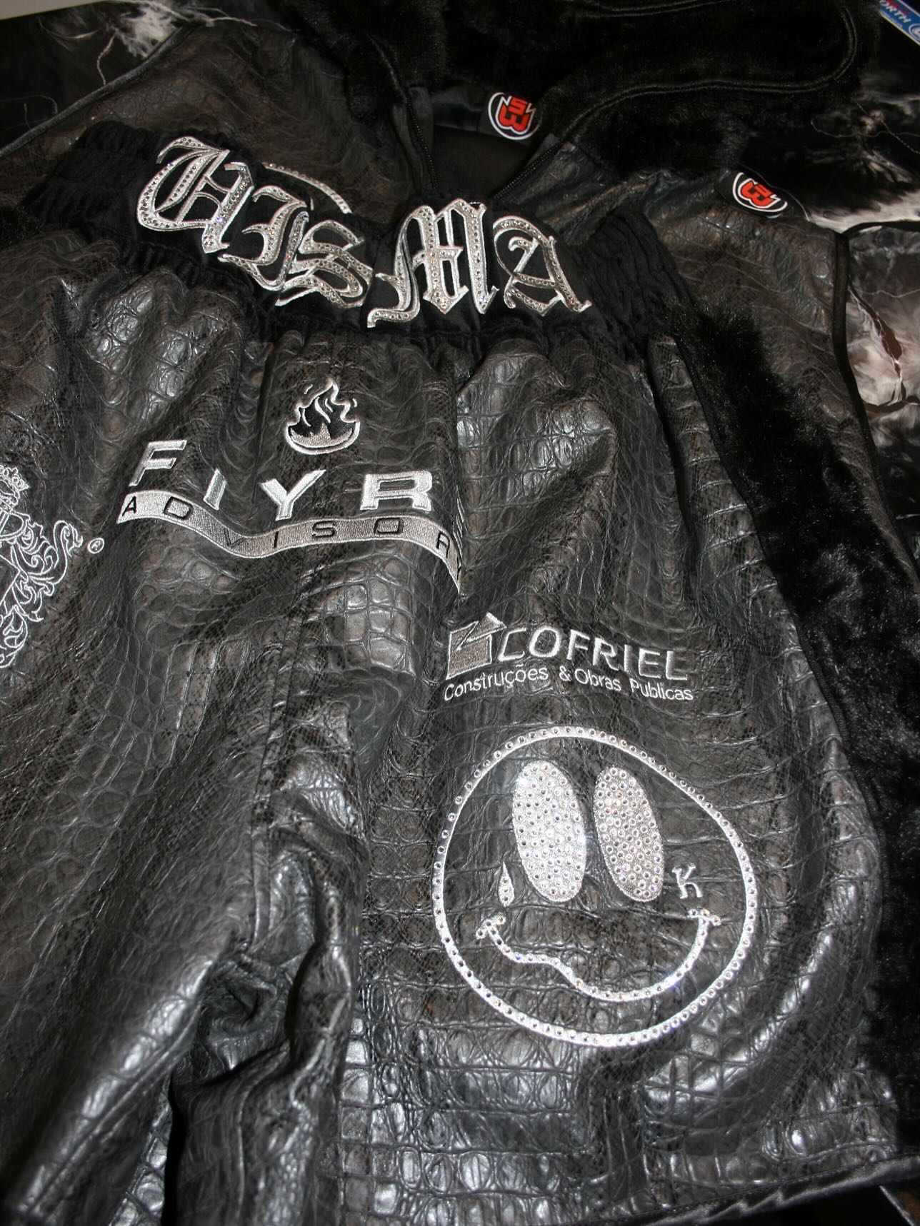 Luxury is at the heart of this bespoke boxing kit. The black croc skin offers a striking visual appeal, while the soft black fur adds a touch of elegance that is rarely seen in boxing attire. To further enhance the kit, we incorporated a crystal nameplate, symbolising both Usima’s brand and the exclusivity of the design. Such meticulous attention to detail ensures that this kit not only performs well but also makes a bold statement during competitions.