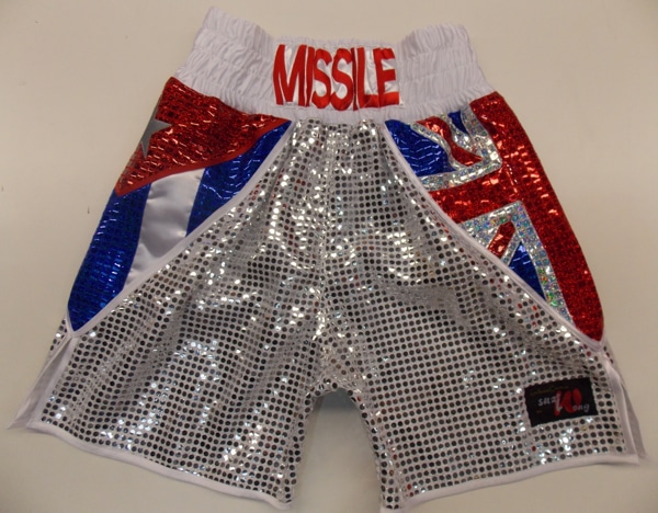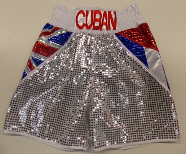 We were asked to make a Cuban and British themed boxing shorts from sparkle fabric.   We can make these shorts in an colour or fabric with any national flags.  Just let us know what you require on an email or one of our design your own templates and we will get back to you with a quote.