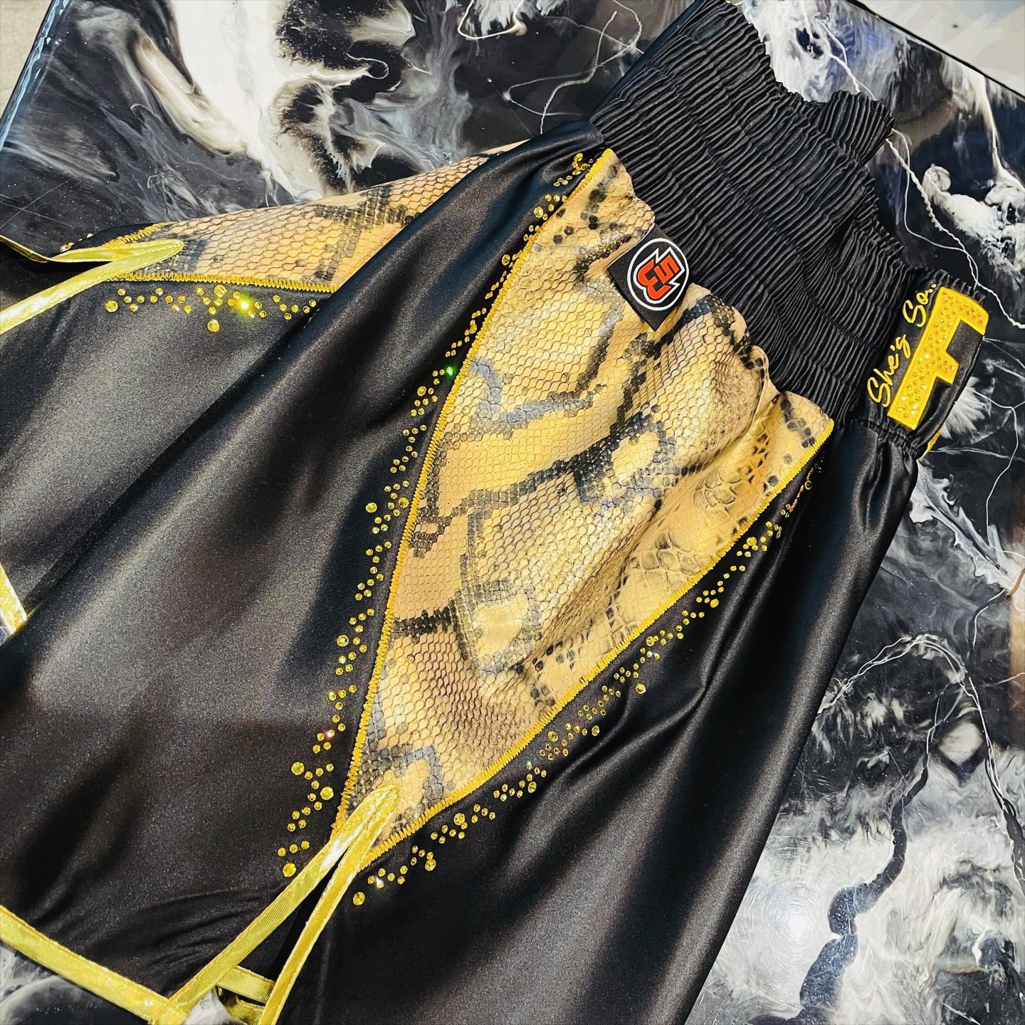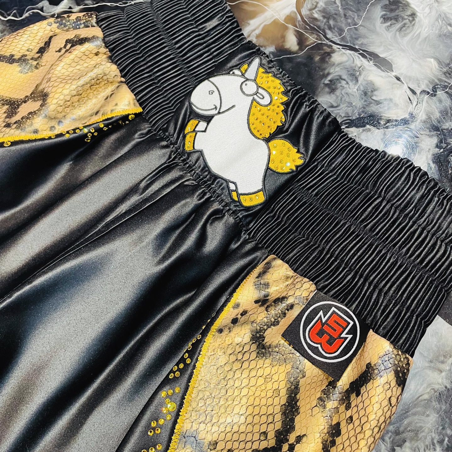 For Francesca’s shorts, we selected high-quality materials that would enhance performance while ensuring comfort. The striking ‘Fluffy the Unicorn’ metallic snakeskin fabric gives the shorts an eye-catching appearance, making a bold statement in the ring. Additionally, the use of luxury satin not only adds to the aesthetic appeal but also offers a soft touch against the skin, crucial for any athlete during intense training sessions.