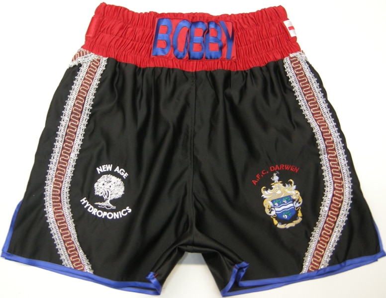 Custom satin black, red and mexican trim style boxing shorts, witha sparkle flag on the bum.  really effective when three colours are used in one short.  For something similar please call us or use the contact us button for a quote.