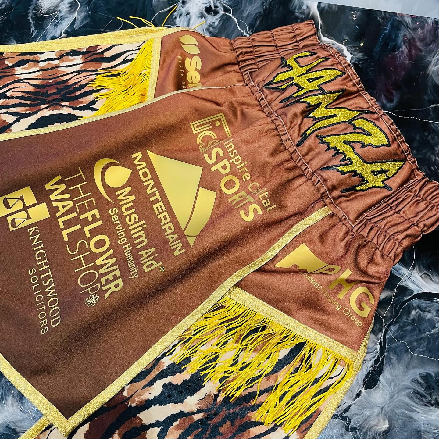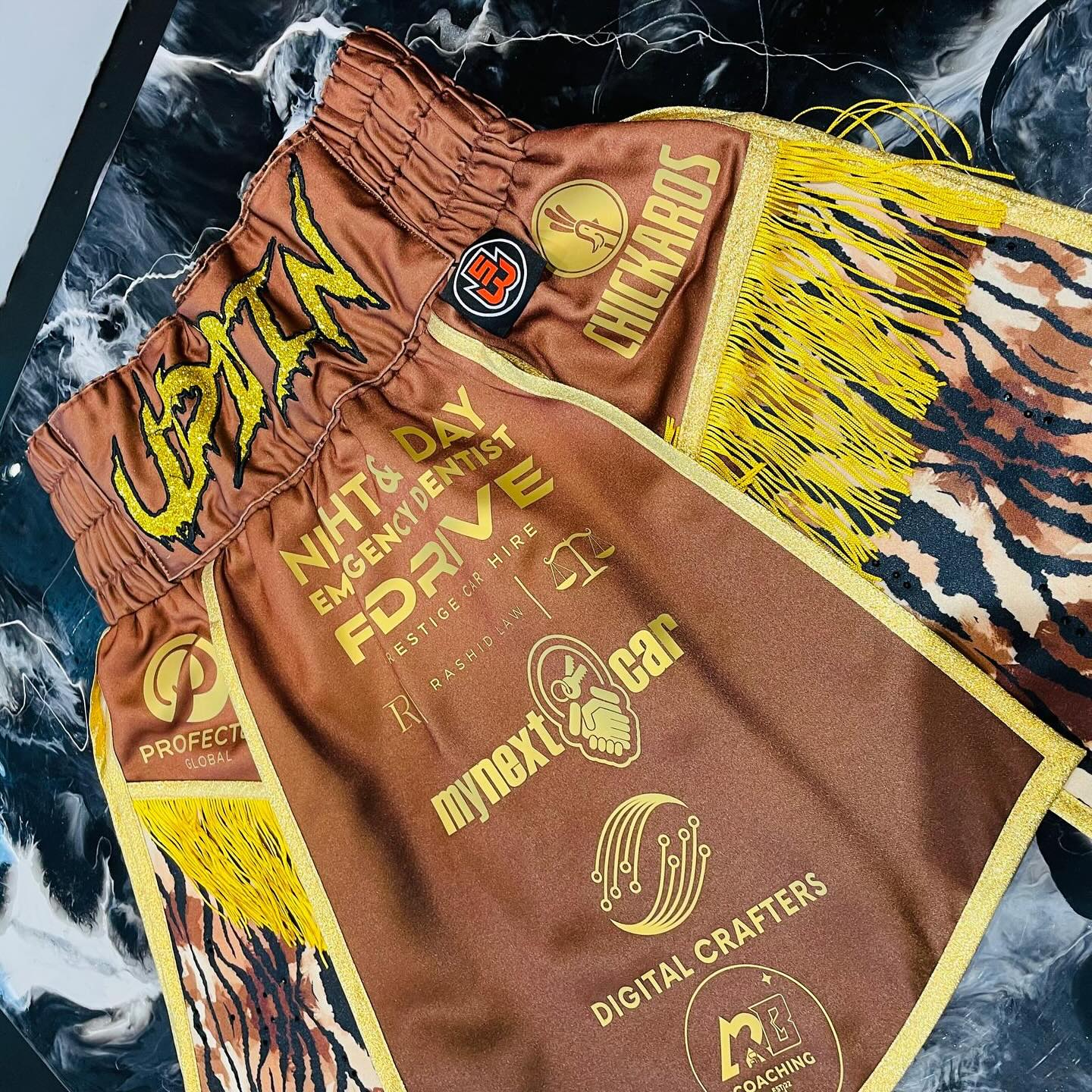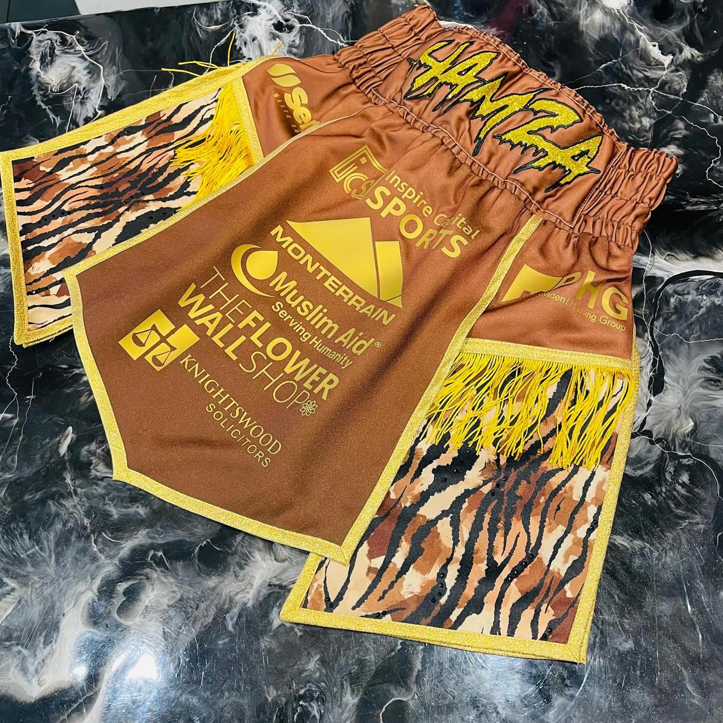 When it comes to professional boxing, an athlete’s attire is as much about style as it is about functionality. Hamza Uddin’s custom boxing shorts, designed by the talented Suzi Wong team, exemplify this balance beautifully. The striking brown and gold colour scheme not only reflects Hamza’s personal brand but also enhances his presence in the ring.