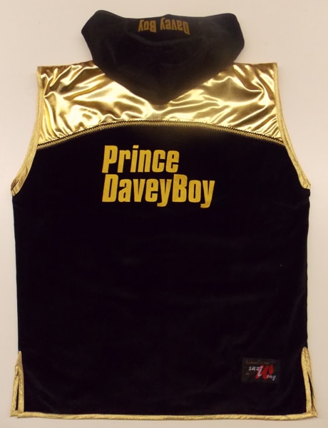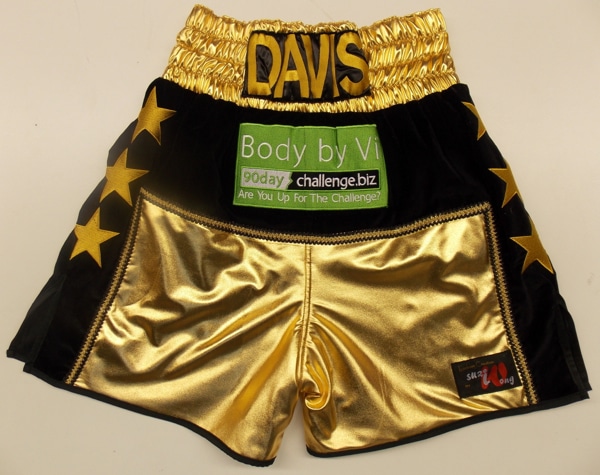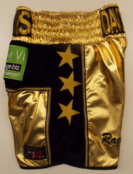 This short was designed around two shorts the Scott Quigg and Paul Smith Jnr styles.  We made them from gold wet look and black velvet with some gold and black mexican trim.  We can make this style in any fabric or colour, with your own names and sponsors on.  Just let us know what you require either using the contact us form, one of our design your own templates or giving us a call.