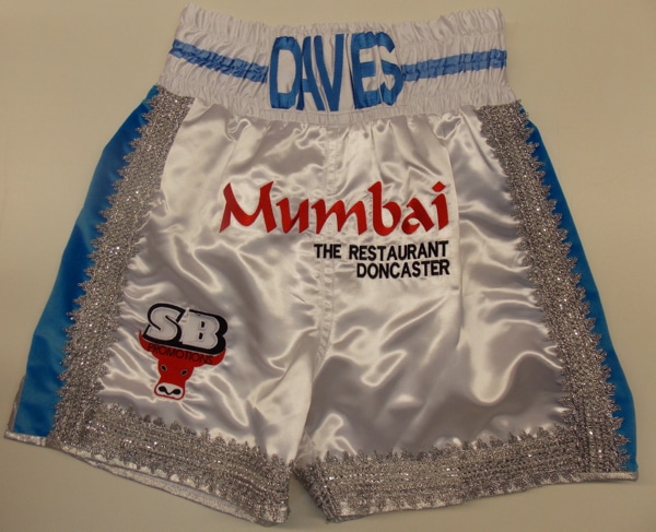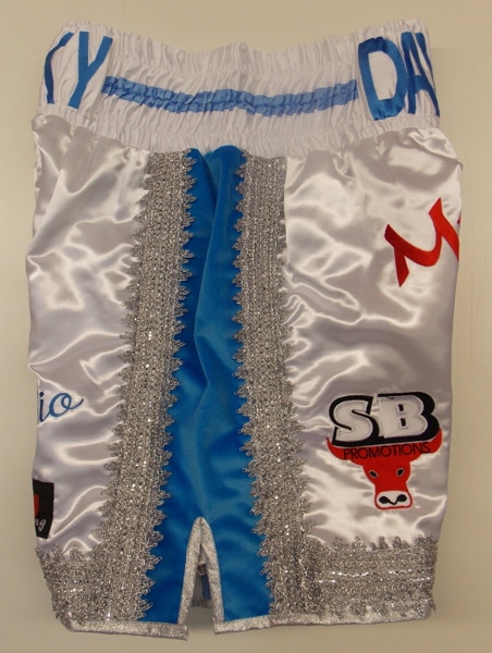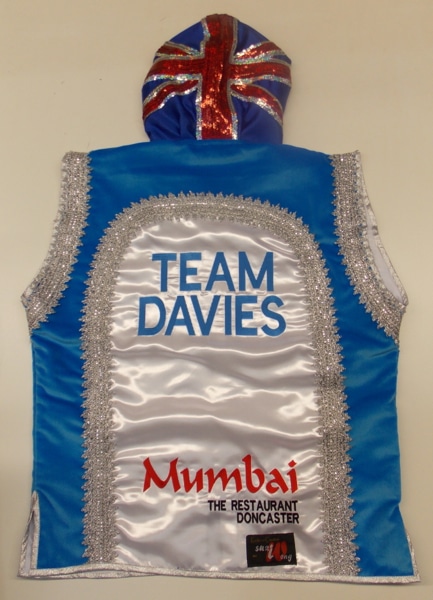 Micky wanted something new and a different style with a mexican theme. We used a white satin and a new blue velvet and silver thick mexican trim to finish the shorts and sleeveless ring jacket off. He wanted something special with a sequin Union Jack on the hood so when walking to the ring and pictures you could see it covering his face. It looks great when done and really set the jacket and whole kit off. We embroidered all his sponsors on all looked great on the white background on TV. We can make something similar in your own colours, fabric, or style with your own names and sponsors on. Just let us know what you require on the contact us page, call us or fill on your details on a design your own template and we will get back to you with a price.