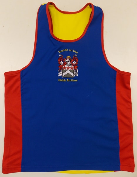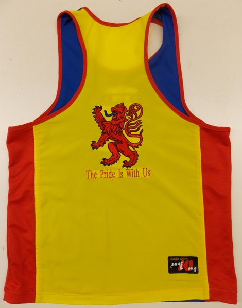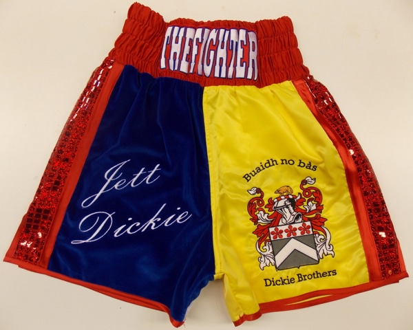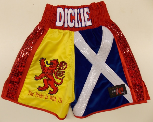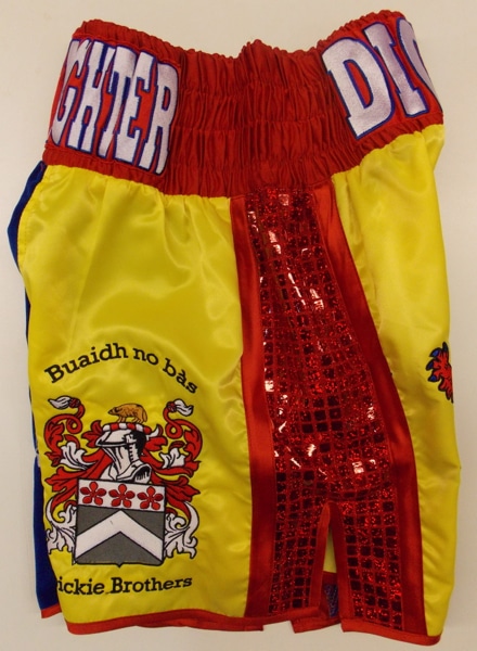 Custom boxing shorts and vest made for all the Dickie family with there family crest embroidery on and the shorts in a Scottish theme with sequin saltire on the leg and rampant lion.  The vests have all been done to match the shorts, and are really effective when worn as a complete set in the amateur boxing tournaments.  We can make something similar with your own family crest or logo on, with also any national flag on.  Let us know what you require on an email using the contact us button, calling us or downloading one of our templates.