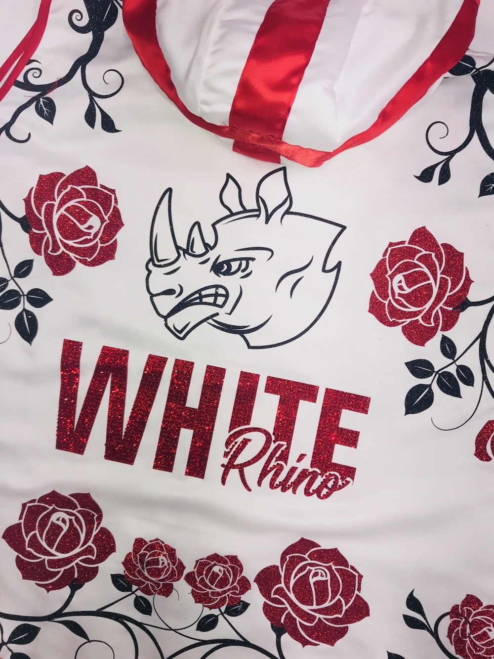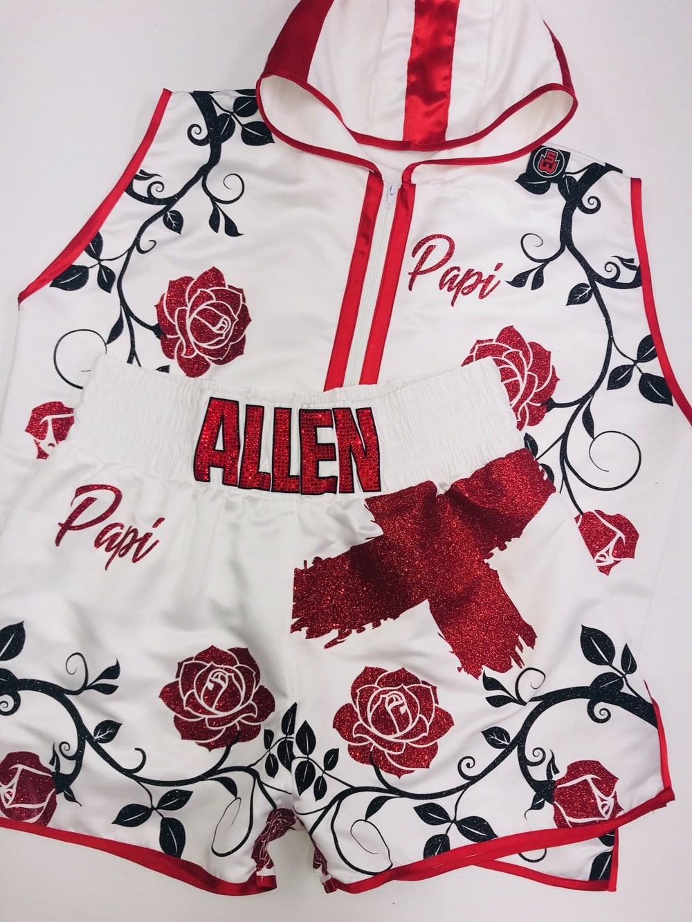 We showed David various designs, including this special English Rose theme, with sparkle red and black prints. England flag on the shorts and hood of the ring jacket.