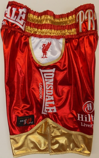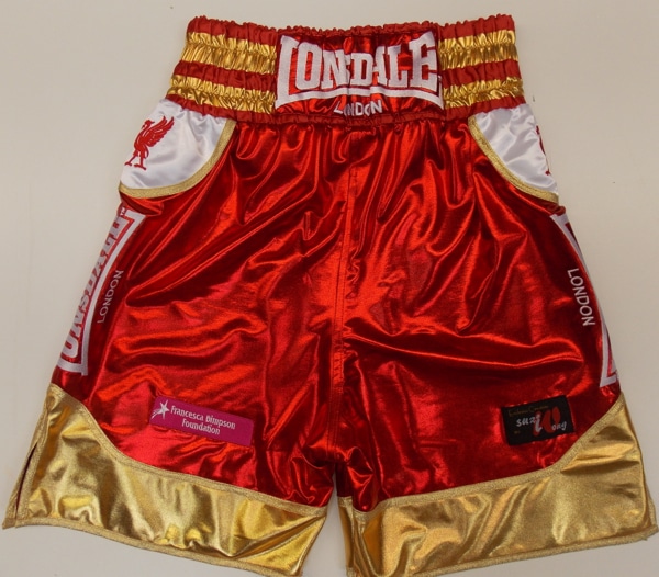 David was making him homecoming in Liverpool and so when we were designing for him we designed around the using the Liverpool Liverbird on his shorts and created a special shaped white panel for the side. We used a wet look fabric for the red and white. We can make something similar to this in your own colours or these if you like them, with your on names on them. Just let us know what you require, you can have this design made in any fabric you want, just use the website to flick through the fabrics you think will best suit your style using the left hand bar. Use the contact us button at the top of the page to tell us what you like and we will get back to you with a price.