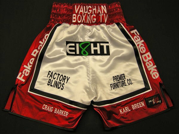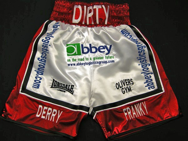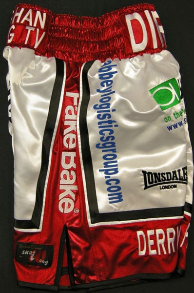 Shorts worn by Derry during his fight with Gavin Rees in Wales.  We went for white satin with a red wetlook panel.  Embroidering all his sponsors the shorts and t-shirts for his team.  We can make this short in the same style in any colour, with your own embrodieries and sponsors.  Please use the contact us button or one of our templates for further information and a quote.