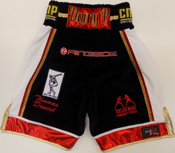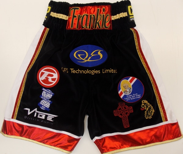 These shorts are a custom short fit for Frankie Gavin but can be made in a longer or shorter style is required. We can make this short in any fabric you require, leatherette, satin etc. Just let us know what fabric, colour and names, sponsors etc you want on your kit and we can quote for you. Use the contact us button at the top of the page and we will get back to you with a quote.