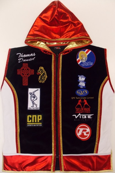 We have worked with Frankie for a long time now and he has always trusted us to design for him and keep him up to date with the latest designs, fabrics and styles. Here we went for a black velvet shorts and sleeveless ring jacket with red and white wetlook trimmed with a gold and red sparkle tape. We embroidered all Frankies sponsors on both items, helping him to keep those who support him happy.