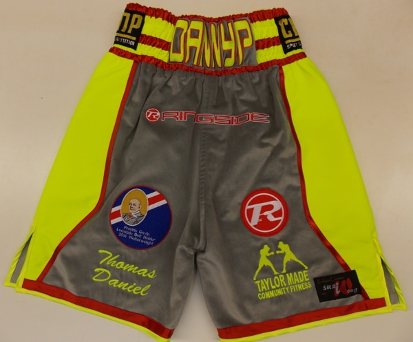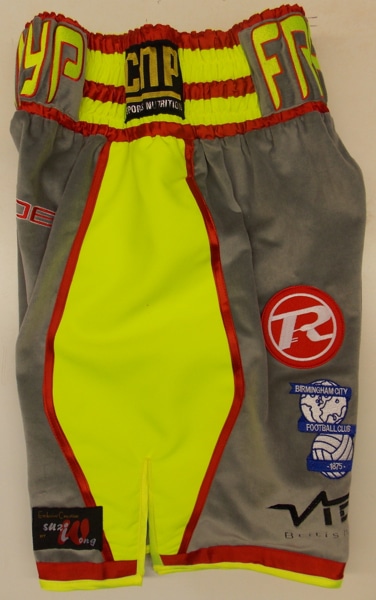Frankie Gavin and Tom Chaney wanted something new just for Frankie and asked us to design a new kit for him, in these specific colours to go with the boots he had chosen.  We went for grey velvet, illuminous yellow with a red trim with all sponsors logos on, including ring jacket and team t-shirts.  We can make your boxing attire with your own sponsors logos on, names, colours, fabrics etc.  Just let us know what you require on an email, phone call or design your own.  You can contact us with the contact us page and we will provide a quote.