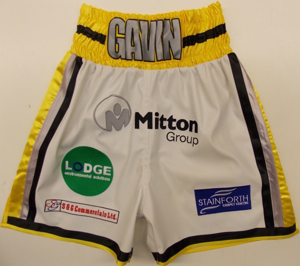 Gavin McDonnel custom made Suzi Wong boxing shorts. Made expecially for his 2015 fight in Sheffield, we went for a yellow, black, silver and white leatherette style with ll sponsors embroidered. We made matching t-shirt for his team and corner men so everyone looked the part on fightnight. We can make simialar boxing trunks with your own names and sponsors on them in your own colours, just using this or any of the style on our website to suit yourself. Just let us know what you require, colours, fabrics, names, sponsors, etc and we will come back to you with a quote. You can use the contact us button at the top of the page to describe the boxing shorts you like or print one of our design your own templates off to fill in and send back to us. We are also available on the phone, numbers above, for information and advice.