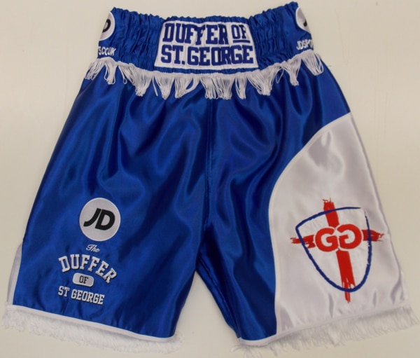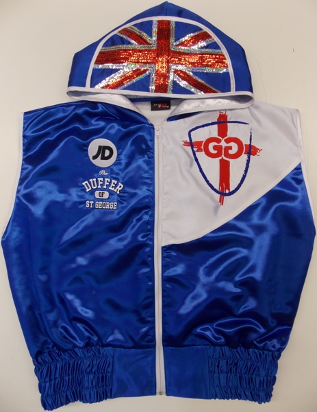 For the biggest fight of the year George went for his traditional boxing shorts he always has with his Chelsea royal blue colour and Union Jack on the back of the bum. We also advised George to have a jacket made due to the outdoor arena of Wembley to help keep him warm in the ring walk and national anthems. We embroidered all his sponsors logos and added his traditional Union Jack on the hood. Sky Ringside came to film us making both Carl and Georges kit as part of there build up to fight night and this was also used in the walk out video for both fighters on the night in Wembley, see it here https://www1.skysports.com/watch/video/9332285/fit-for-a-champion We can make something like this is your own colours, using your own names and embroideries. Let us know what you require using the contact us button at the top of the page and we will get a price back to you.