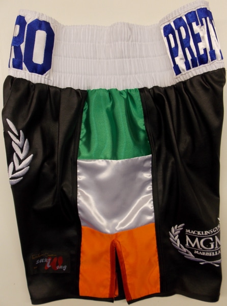 Gero wanted something like Floyd Mayweather leather style boxing shorts he had in Mexican colours, but wanted an Irish theme.  We went for black faux leather, with satin ireland flag on both side nice and thick so it made a show of them.  White band and blue letters to show up on Sky Sports.  For something similar in these colours, or with your own colours, fabrics, and flags, let us know what you require using the contact us button, just type, waistband names, shorts you like and what you want on them and we will get back to you with a timescale and quote.