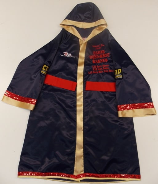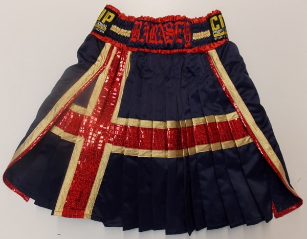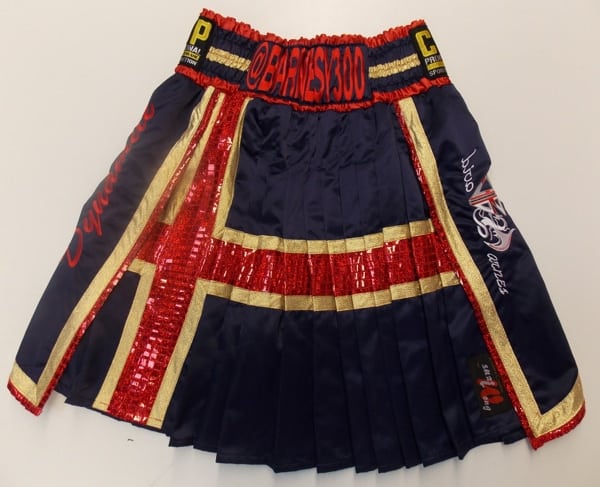 David Barnes wanted something special when boxing Frankie Gavin for the British Title and we made his a gladiator style pleated shirt with a St George cross running through it and matching boxing robe.  This was a very complicated but very effective design made from navy blue satin and trimmed in gold and red.  We can make this style with your own names and sponsors on.  Let us know what you require on an email using the contact us button, calling us on the number above or print out on of our design your own templates.