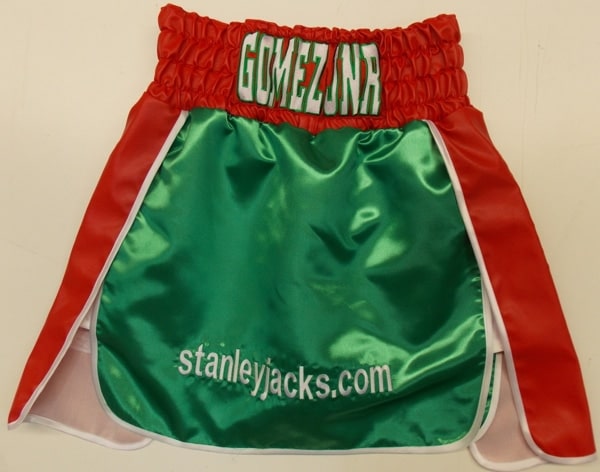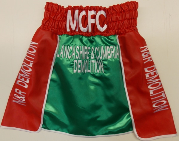 Michael Gomez Jnr wanted something in Mexican colours in green satin and red leather in a gladiator style.  Really good for having sponsors on the sides and skirt part.  We added outline name embroideries on the red leather waistband.  We can make something like this in your own colours and fabrics with your own names and sponsors on there.  Let us know what you require using the contact us button and we will get back to you with a price.