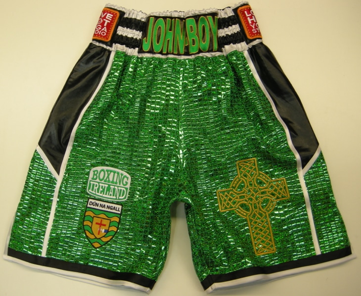 Complete custom boxing kit, including shorts, ring jacket, corner jackets and tracksuits.  All with custom logos and sponsors.  Green sparkle with wet look black panels and white trim.  We can create a real team image for clubs, weigh in’s, press confrences and such like in the boxing world.  Looking the part is a massive part of the game and gives the right impression to all watching.  For a quote on custom kit, please let us know what you require on an email or a phone call and we will get back to you with a price.