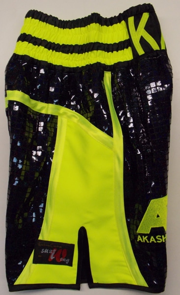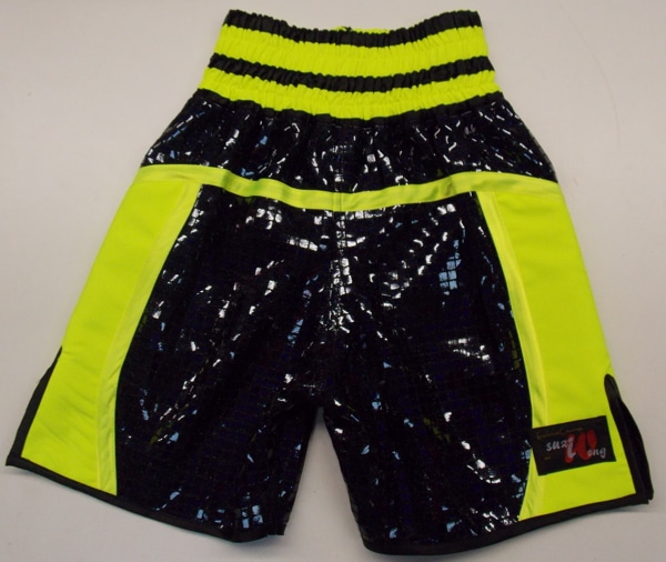 The illuminous colour is very popular at the moment with Nike producing a boxing boot to match. We have been asked for many colours to go with the illuminous and most work well, including blue, black, red and grey. Have a look through our portfolio for ideas as there are some new style shown using the illuminous. We can make these shorts in any colour in this style with any fabric. Just let us know what you require on the front and back waistband and anything else you require on them, maybe the lightening like is shown here, a cross, poppy, love heart of football club badge. We can embroider many things for an extra charge. You can also print off one of our templates to fill in and let us know what you require and we will get back to you with a price.
