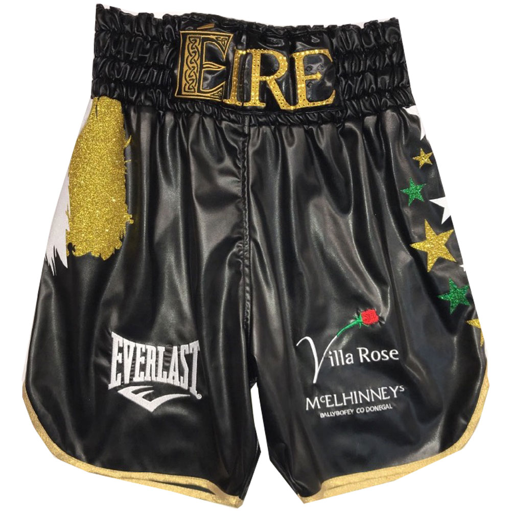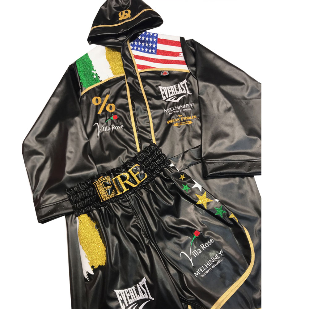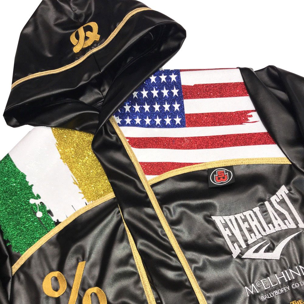 Jason Quigley custom-made black faux leather boxing robe and shorts. Fighting in USA Boston, Jason takes on Daniel Rosario Cruz at Super Welterweight.