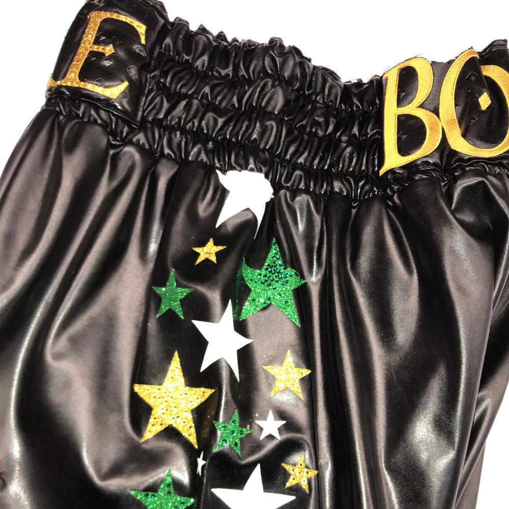 We went for a black faux leather for the boxing robe and shorts, trimmed in metallic gold. We wanted to get an Irish theme going and so decided on the green, white and gold trims. Sparkle stars and Ireland flags, adorned in Austrian Crystals crystals really set the boxing robe and shorts off.