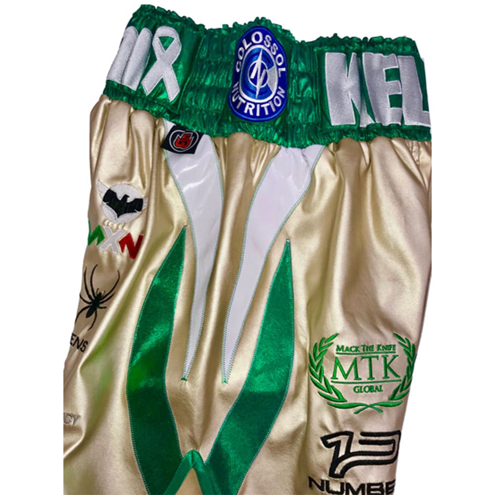 We went for a faux gold leather boxing shorts, trimmed in green wet look, white and alternate thread details.