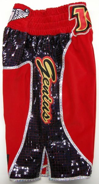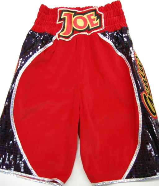 Joe Murray shorts red velvet trimmed with gold and black sparkle, with his speical designed name coming onto the waistband and with sequins round it to make it stand out more.  We can make these shorts in any fabric with your own names on there, own colours and trims.  Please use the contact us pafe for more infomation or one of our custom templates to get a quote.