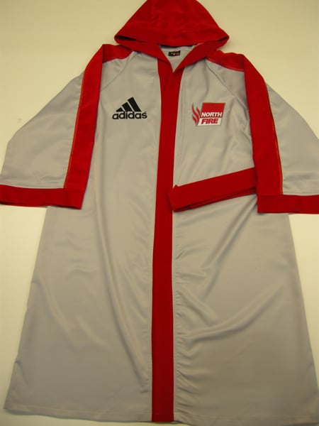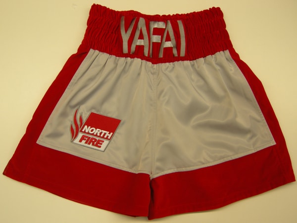 Boxing shorts and robe worn by Olympian and GB Boxing Squad member Kal Yafai on his pro debut under Matchroom Sport.  Kal went for a Floyd Mayweather style colour with grey and red velvet border line and wasitband and panel down the sleeves of the gown.  For something similar please use the contact us button at the top of the page to let us know what you require or one of our tempaltes and we will get back to you with a quote.