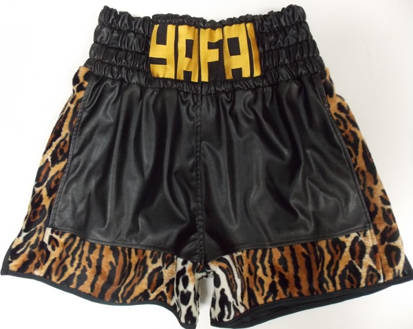 Kal Yafai as every wanted something different for his custom made boxing shorts and went for black leather with tiger print with a new font on the waistband.  There shorts were really effective and look great in the shorter retro style.  We can make something similar like this or why not try zebra or giraffe print as a change?  Let us know what you require using the contact us button and we will get back to you with a price.