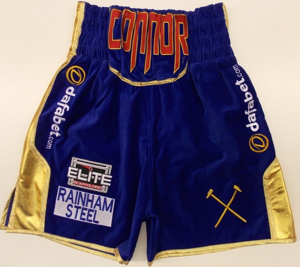Kevin went for his signature Blue Velvet shorts with gold wetlook trim panel boxing shorts, with outline names bigger coming down onto the shorts.  We embroidered all his logos on to make sure he looked the part.  For something similar in these colours or your own, let us know what you require by sending us an email on the contact us page (top right).  Tell us the colours and fabrics you like, what you want on them, names front and back band, legs, etc and we can come back to you with a quote.  Any of our shorts can be made in any fabric, in virtually any colour, the choice is yours.
