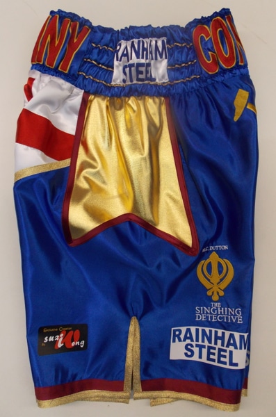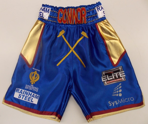 Kevin left it to us to design him some shorts around his traditional blue colours and with the Hammers on for West Ham united.  We wanted to do something different for him adding some wet look gold panels in there with maroon trim as a nice gesture to West ham also.  We also put his St George cross on the bum along with all his sponsors embroidered and printed on.  We can put anything on your shorts provided we have the correct information, just send us an email and let us know what you require.  Names on the waistband, logos, colours, flags etc and we will get back to you with a price.