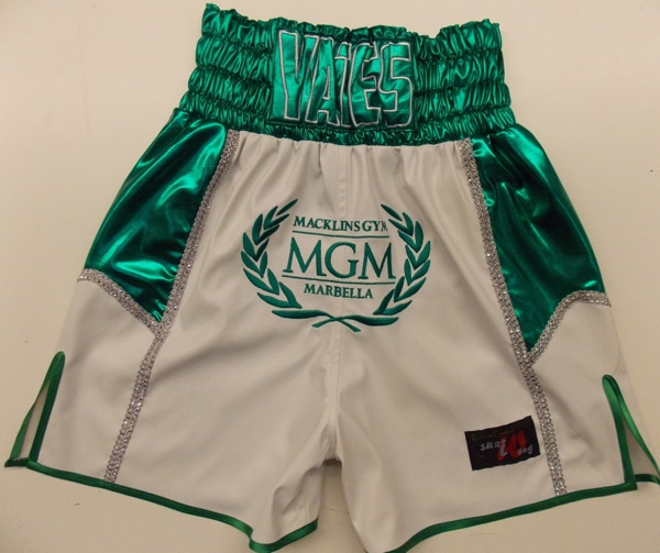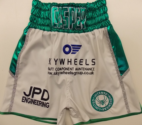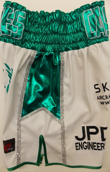 Kofi Yates as always asked us to design something new for him around a white and green theme. We went for white faux soft leather with a green wetlook band and side panel with a thin silver mexican style trim around it. This design is really nice and clean, with loads of room for sponsors logos and embroideries. We can make this design for any kind of fabric and it would work nice with velvet and satin as well as the wet look trim. For something similar in your own colours and fabrics, let us know what you require either calling the number above or on an email using the contact us from and we can come back to you with a quote.