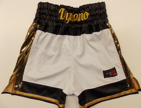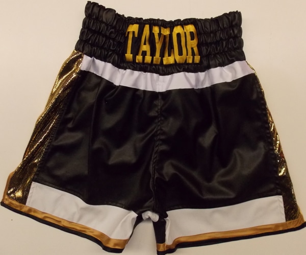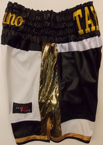 Liam Taylor came into our studio as he always does to see us and design his new boxing shorts, run through fabrics and get a design sheet to take home. You too can come into our studio to see us and create a design for your new trunks and get measured. All you need to do for this service is make an appointment by calling the number above. Liam liked the new faux leathers we have been using and wanted to go for white, black and gold theme. We went for a reverse boxing short, so it was black as the main body on the front and white on the back with gold wet look snake style panel down the side. This is a new design and worked really well for this short and style. We can make this design in any fabrics, velvet, satin, sparkle, etc. We also embroidery Liams name on the band in a nice new script font we have. For something similar to this design just simply drop us an email of what you require or give us a call. Or you need to do is list what you require, fabric, style, names you want on and sponsors logos also if you have them. We will then get back to you with a price.