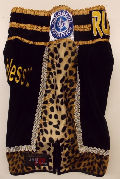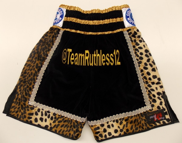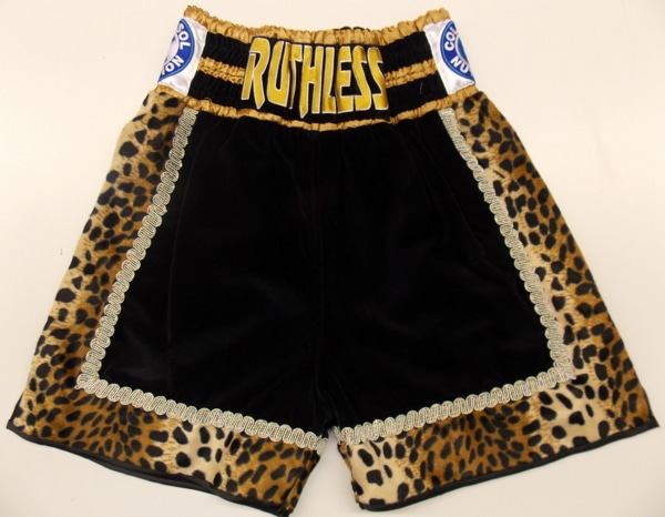 Ryan Doyle wanted something simple but classic with black velvet trimmed with gold and leopard Prince Naseem style panels.  They are a really neat and classic style shorts, for something similar use our design your own template to draw out and send back what you want, call us for a quick quote or send us an email on the contact us button and we will get back to you with ideas and prices.