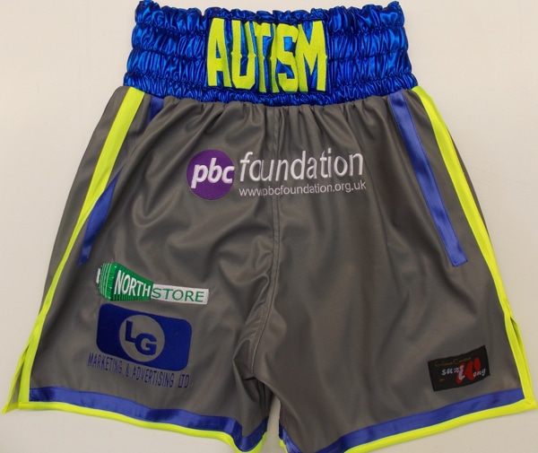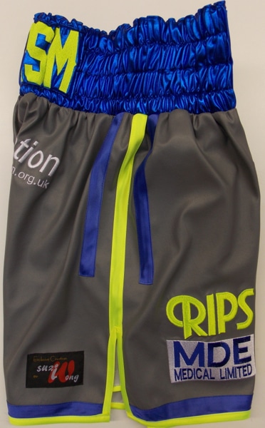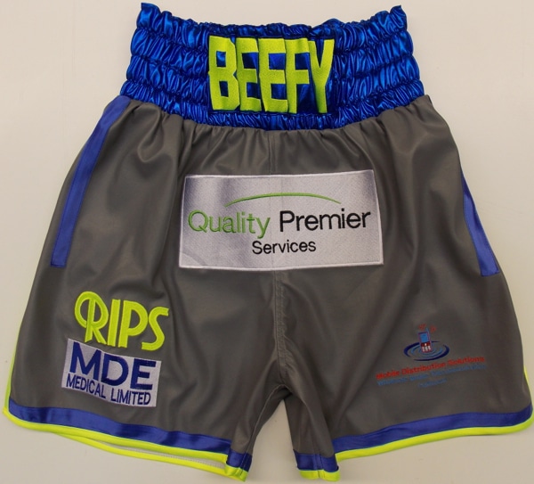 Liam Smith went for grey leather shorts with electric blue wet look and illuminous yellow trim.  A really nice and clean cut look that can work well with different fabrics and colours with your own names on.  Please let us know what you require on the contact us form and we will come back to you with a quote.