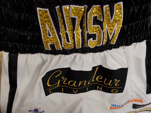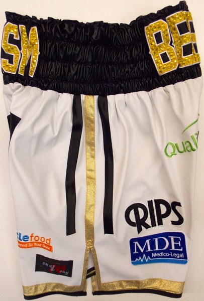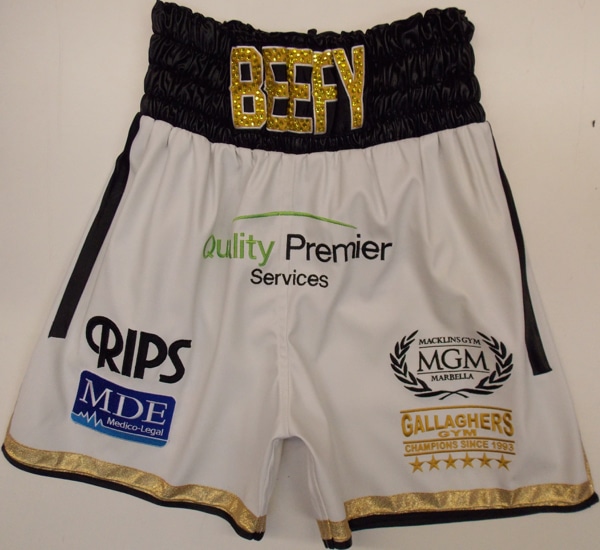 Liam came in to see us to design some new shorts for his recent fight in Liverpool, he went for his classic design with three stripes down the sides. We went for a white leatherette with black wetlook waistband and gold metallic and black trim. We also blinged his names up on the band with Austrian Crystals dimante crystals to make them really stand out. This is a technique we have been using for many years, including for Ricky Hatton when he fought Floyd Mayweather, it is available for certain embroideries for an additional charge.