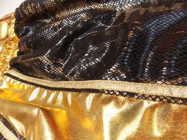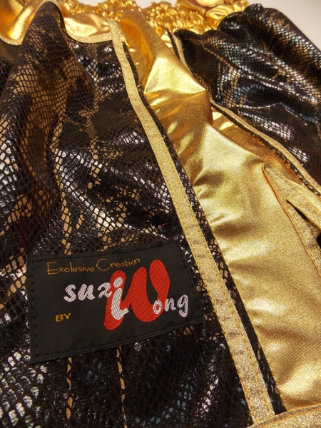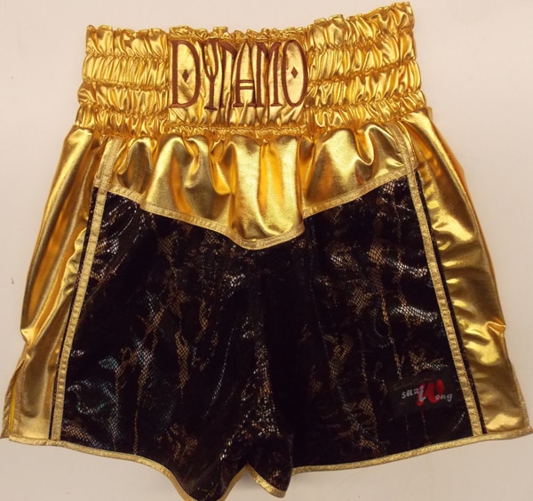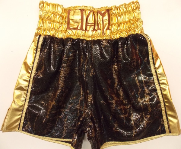 Liam Taylor came in to the studio to see us to design his new shorts and check out new fabrics. We had a new brown and gold snake skin fabric in he loved. We have limited supply of this, so if you like it get in touch for something different. We trimmed with gold wetlook and band with sparkle gold trim, embroidered his names in a new style funky font.