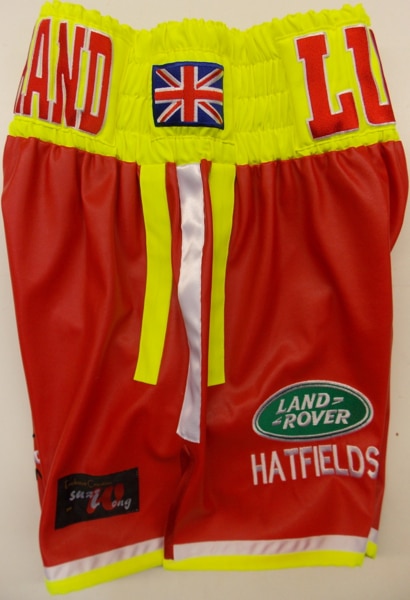 Luke Campbell wanted something new and eye catching for his US debut on the Kell Brook v Shawn Porter bill in New York.  We went for red leather with illuminous waistband and white and illuminous trim on the sides and bottom.  One of our favourite designs this year, it is a really clean and eye catching design with plenty of room for additional embroideries.  We can make something similar for yourself in either Luke colours and fabrics or your own, with your own names embroidered on your boxing shorts.  Let us know what you require on the contact us page and we will get back to you with a price .