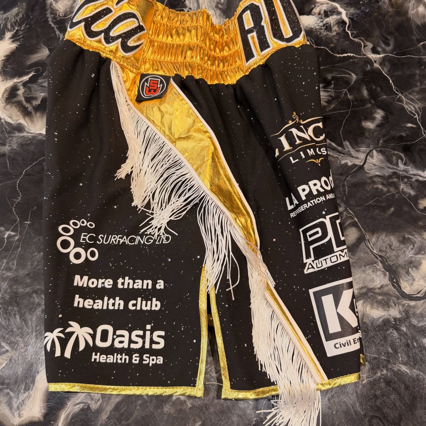 In modern fightwear, embroidery needs to do two jobs: represent the athlete’s brand and remain readable under harsh lights and fast movement. For Levi Giles, the Suzi Wong Team ensures that sponsor placements and design elements are balanced for symmetry, camera visibility and garment integrity. We use specialist embroidery techniques and stabilisation methods to keep stitched logos and lettering looking sharp on performance fabrics, maintaining a premium finish that matches the overall luxury look of the shorts.