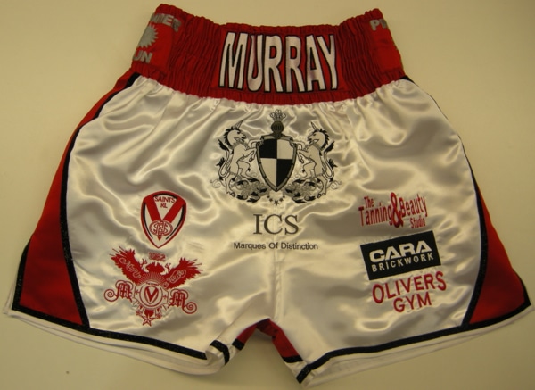 Martin went for his traditional St Helens colours of red and white for his boxing shorts and corner jackets, with all his sponsors badges on for his massive fight vs Sergio Martinez in Argentina. If you want something similar you can have the shorts in any material, wetlook, velvet, satin, sparkle. Just let us know what you require using either one of our design your own templates or on the contact us button at the top. Put all your details down, what names you want on the front, back etc, fabric, colours and we will get back to you with a price. All our items are custom made and therefore require a custom price.